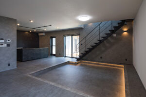 玄関に入ると、ライトグレーの壁とグレーのタイルが迎えてくれます。