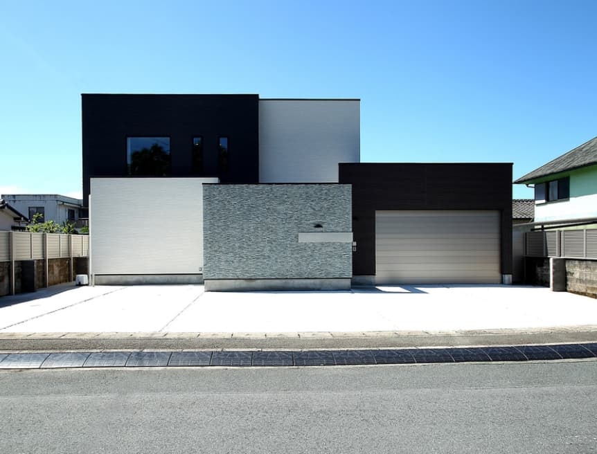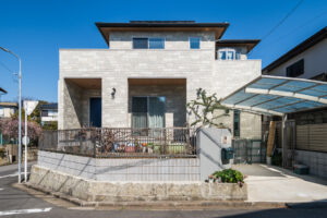 玄関に入ると、ライトグレーの壁とグレーのタイルが迎えてくれます。