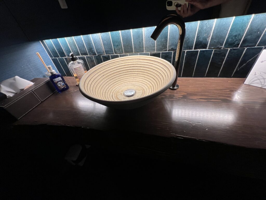 手洗いカウンター背面には、【名古屋モザイクCrogiolo MRZ-F7000】のタイルをアクセントに配置。自然光や照明の加減で表情を変えるタイルの質感が、訪れるたびに新鮮な印象を与えてくれます。