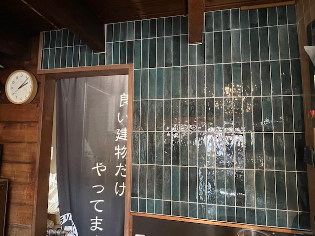手洗いカウンター背面には、【名古屋モザイクCrogiolo MRZ-F7000】のタイルをアクセントに配置。自然光や照明の加減で表情を変えるタイルの質感が、訪れるたびに新鮮な印象を与えてくれます。