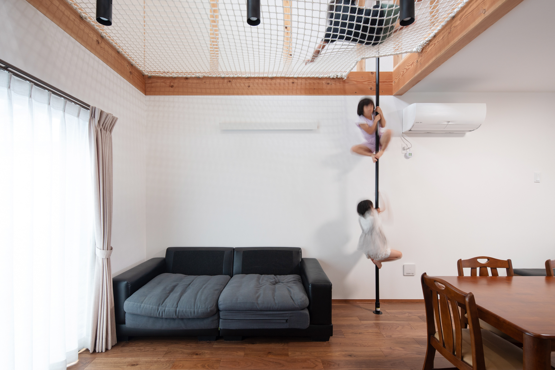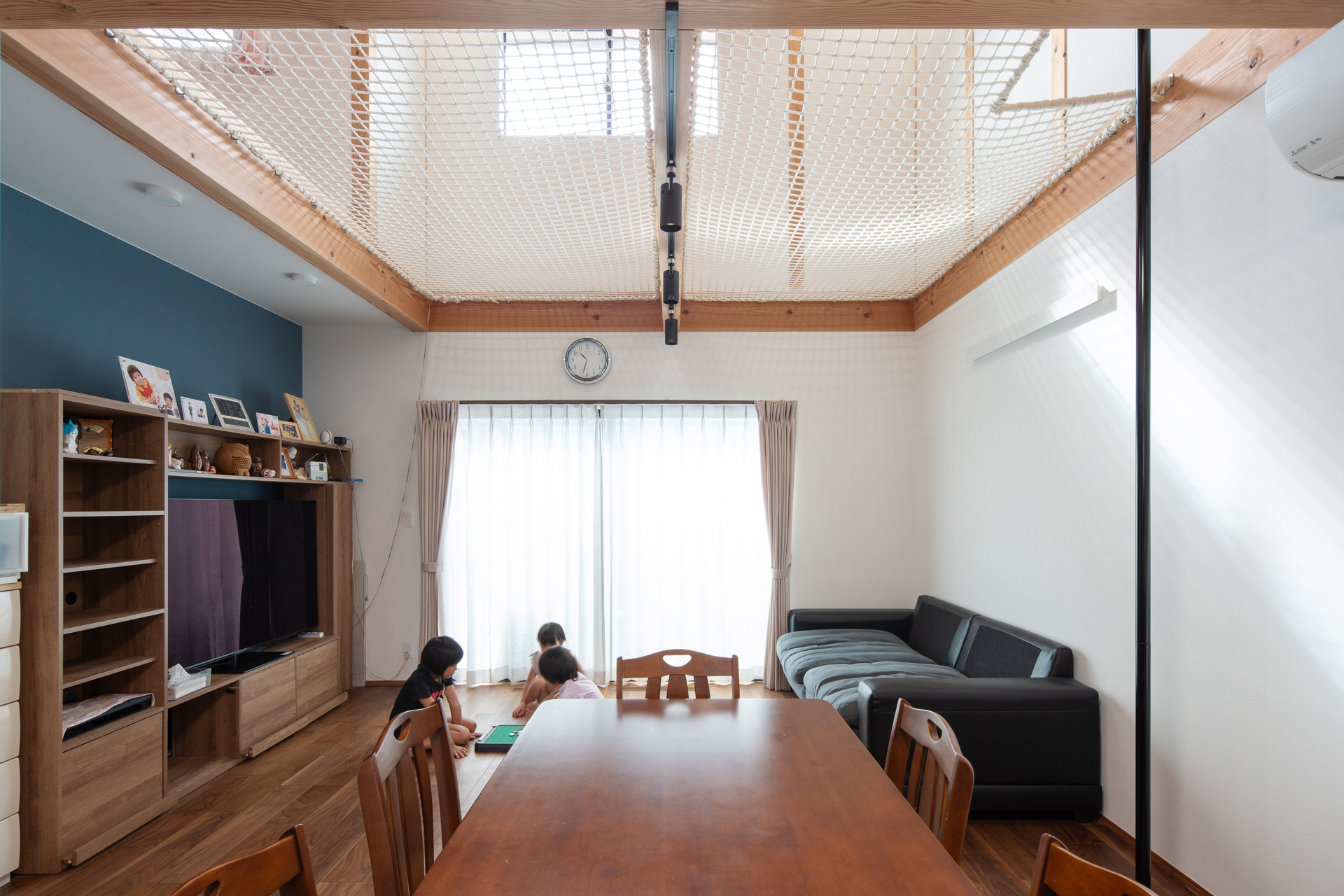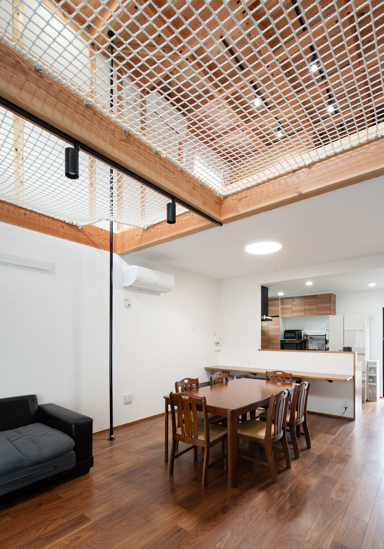 リビングの天井を見上げれば、アスレチックネットの広がる大空間。