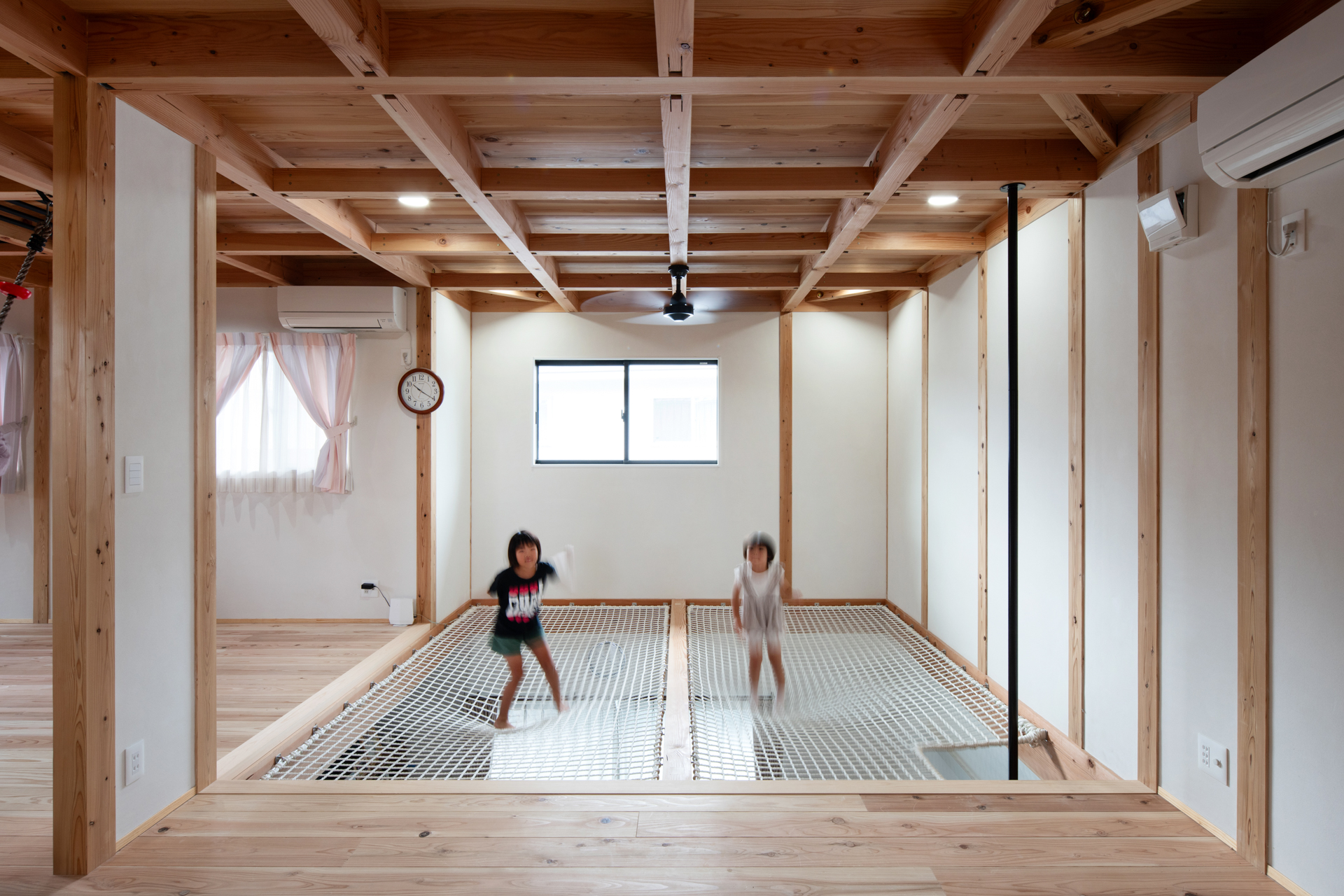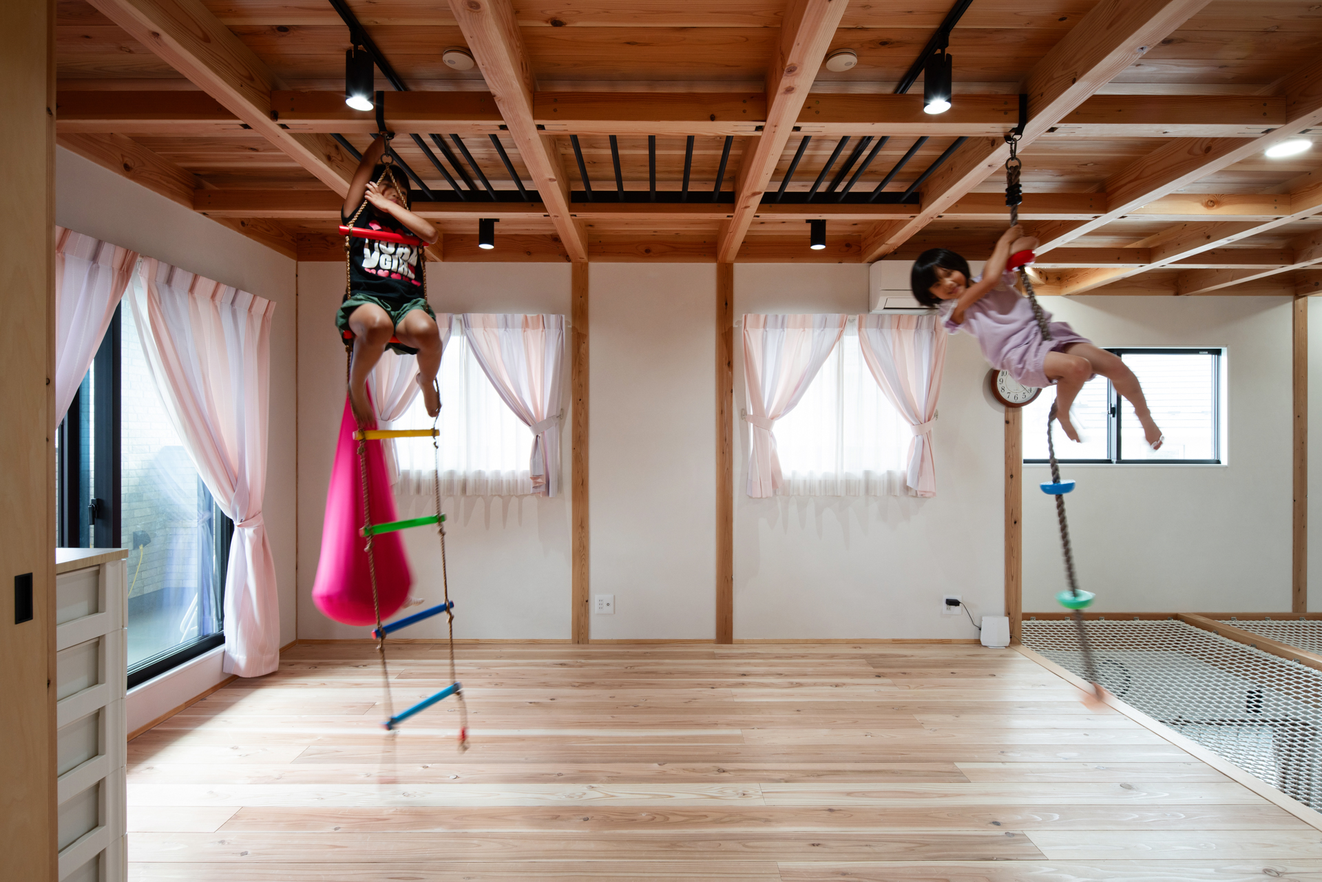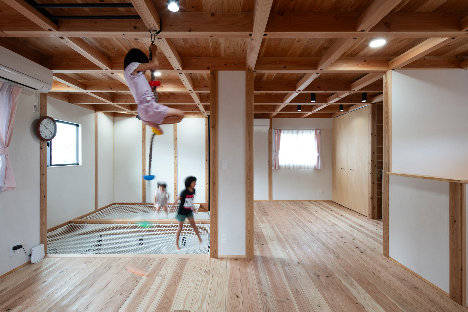 リビングの天井を見上げれば、アスレチックネットの広がる大空間。