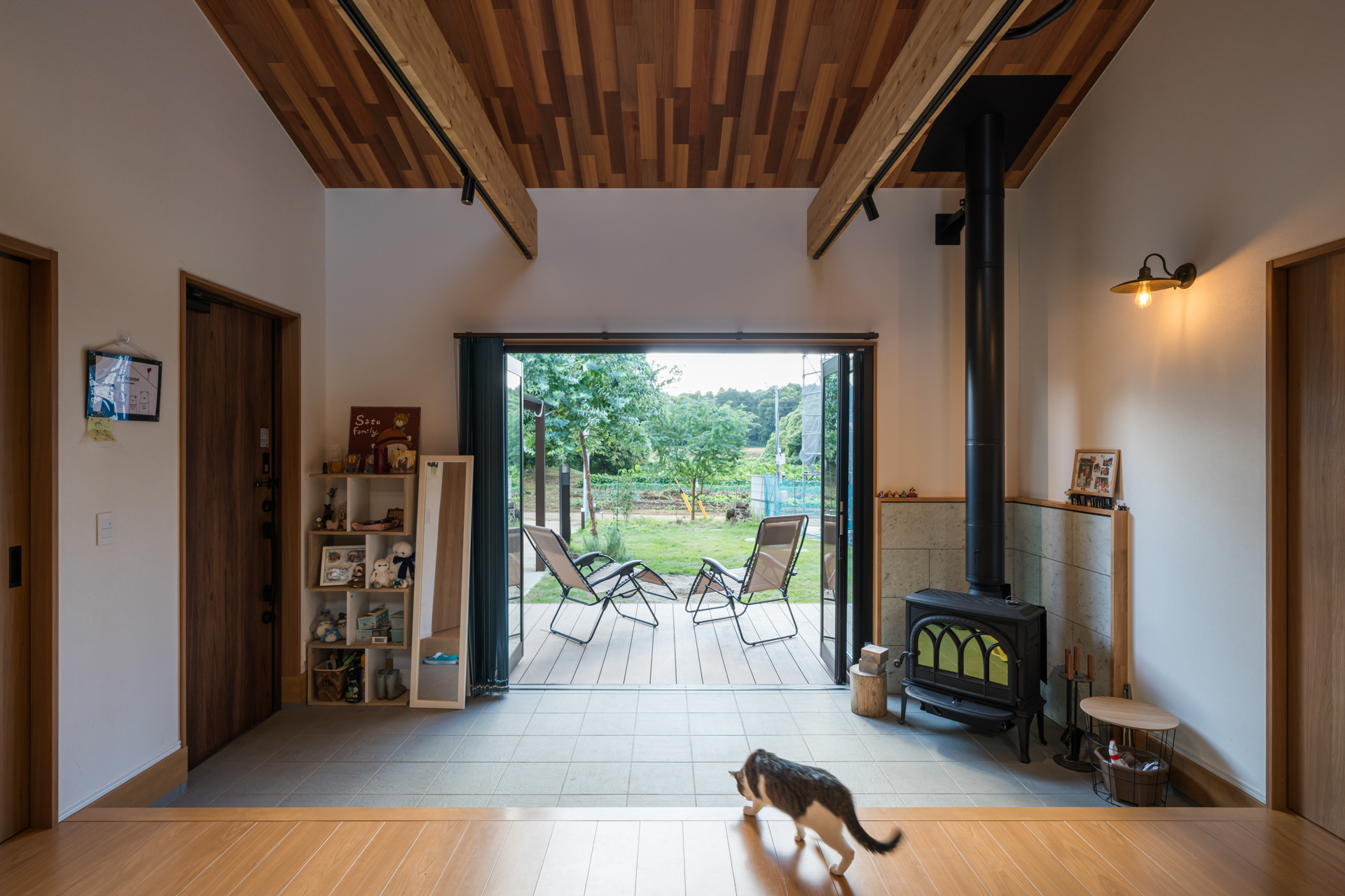 奥様の目線に立った開放的なキッチンからは、リビングの先に広がる薪ストーブのある土間、そしてそのまま続くウッドデッキまで、視界が一気に広がり、まるで毎日がキャンプのような暮らし。