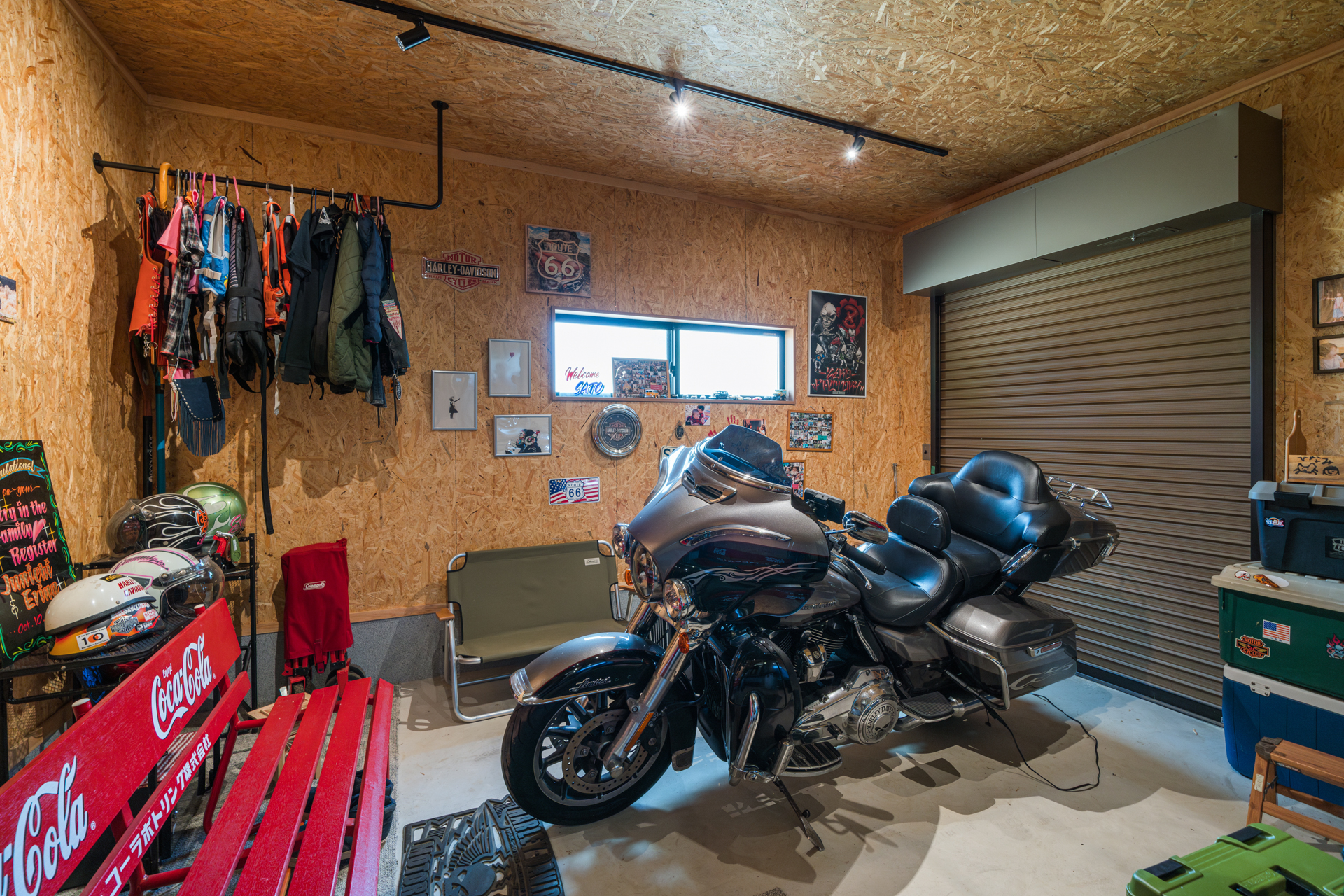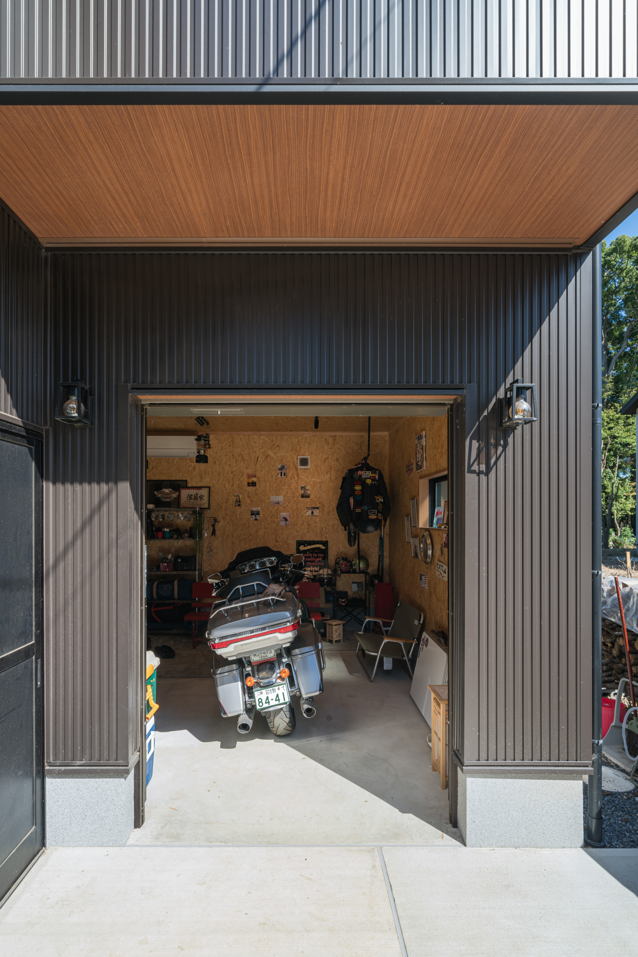 ご主人のこだわりが詰まったバイクガレージは、大切な愛車を眺めながら過ごす至福の場所。