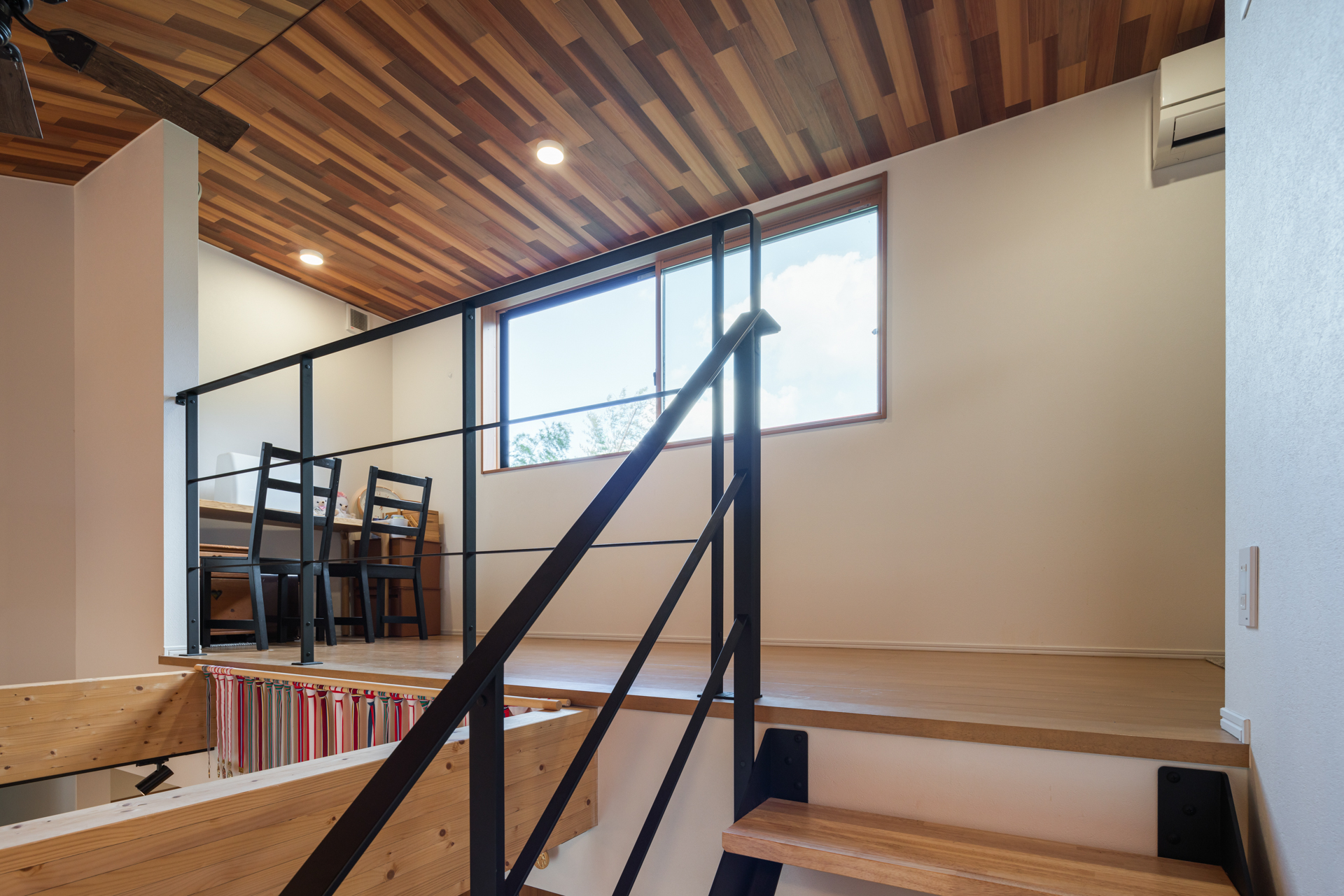 二階のワーキングスペースにはたっぷりと光が差し込み、仕事をしながらもリビングを見下ろせば、子どもたちが遊ぶ様子が自然と目に入ります。