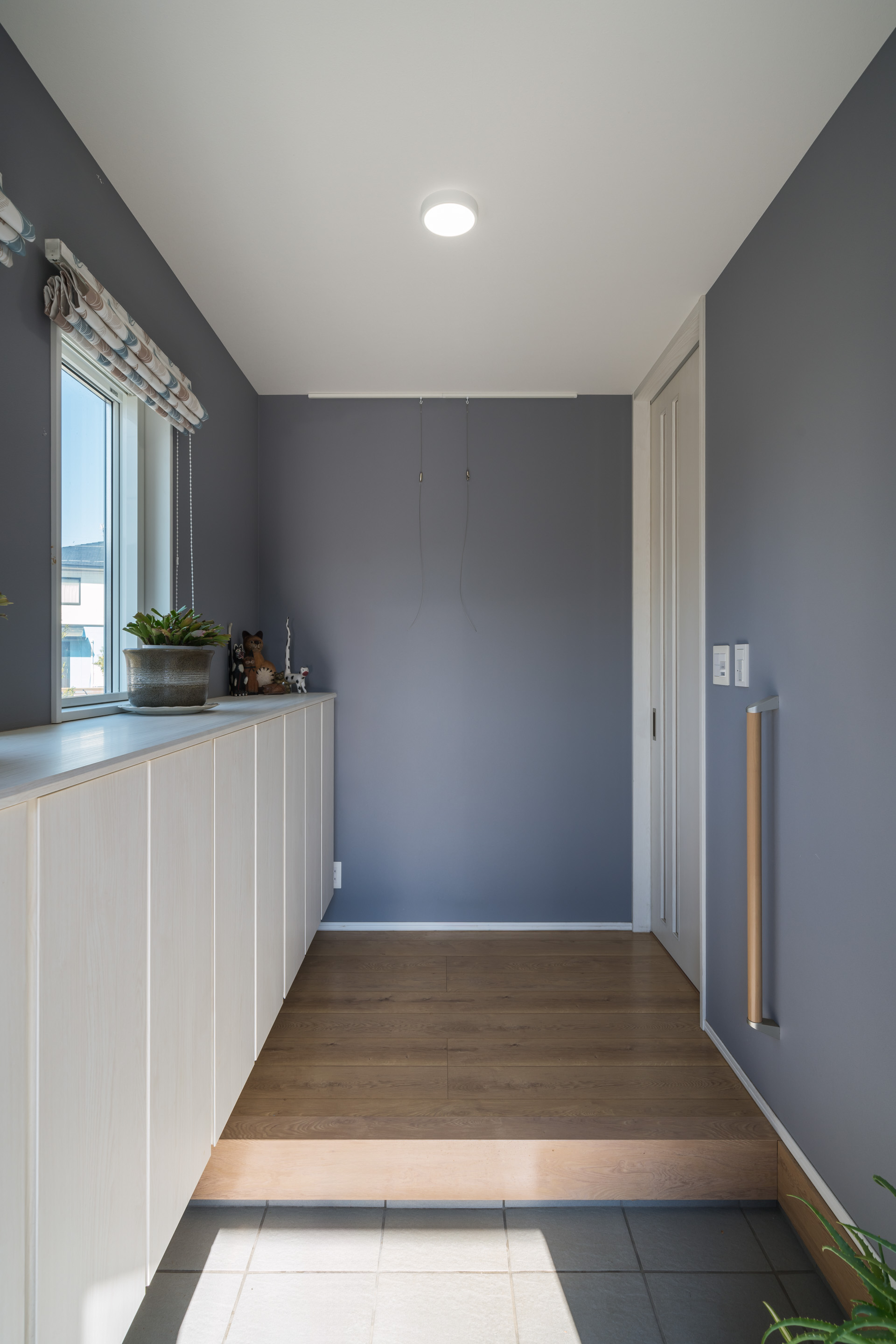 一階は、ブルーグレーの壁紙に白を基調とした建具を合わせ、